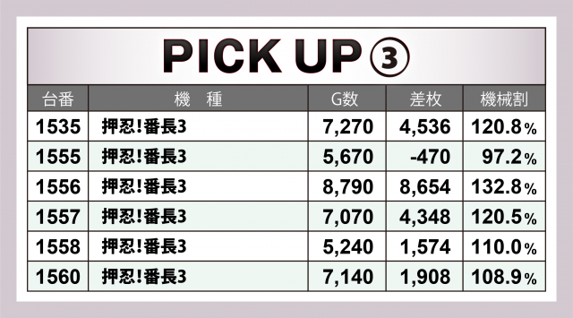 またこの日は3機種6台ずつによる横並び好況スポットが出現。いずれも高いプラス差枚台が生まれる中、『押忍!番長3』がトータルで+2万枚を突破!