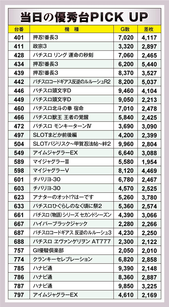 優秀台をチェックすると、やはり強いのが『押忍!番長3』。+5,440枚の434番台、+4,117枚の401番台、+3,527枚の439番台と優秀台がズラリ。それに続いたのが、+5037枚の『パチスロコードギアス反逆のルルーシュR2』の442番台、以下、+4,469枚の『マイジャグラーⅤ』598番台、+4,104枚の『パチスロ頭文字D』446番台などが盛り上がりを見せていた。