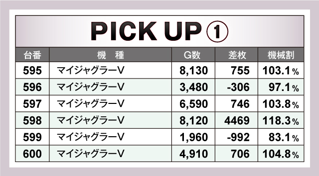 ピックアップ機種では、『マイジャグラーⅤ』の595番台〜600番台の6台中4台がプラスで、トータルの差枚もプラスだった。