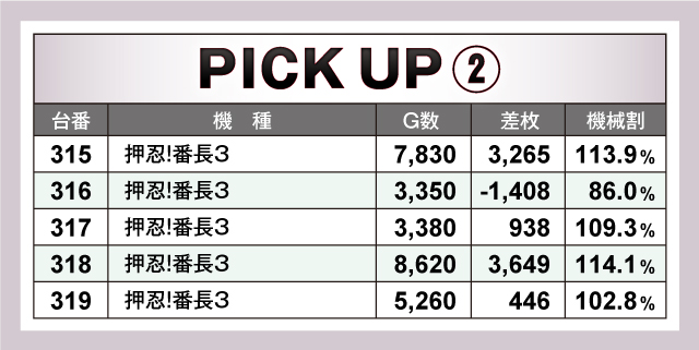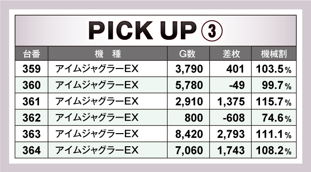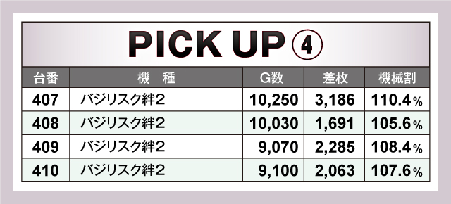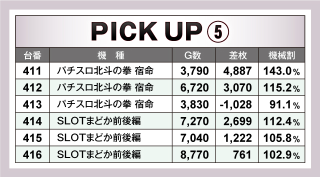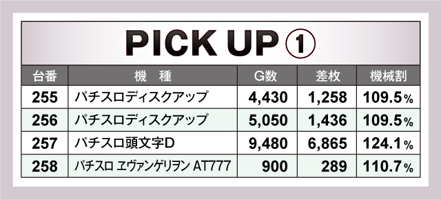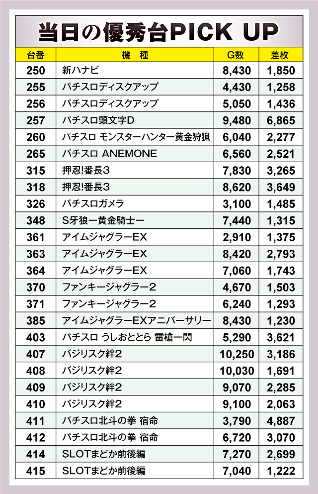 ピックアップ機種では、並び機種の活躍が目立っており、前述の『パチスロ頭文字D』を含む255〜258番台、『押忍!番長3』の315〜319番台、『アイムジャグラーEX』の359〜364台が目立っていた。中でも、『SLOTバジリスク〜甲賀忍法帖〜絆2』、『パチスロ北斗の拳 宿命』、『SLOT劇場版 魔法少女まどか☆マギカ[前編]始まりの物語/[後編]永遠の物語』の3機種が並んだ407〜416番台は、計10台中9台までがプラス差枚を計上していた。