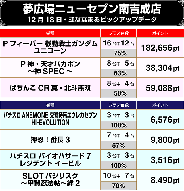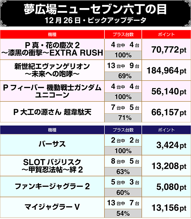 4台設置の『Pフィーバー 機動戦士ガンダムユニコーン』と『P真・花の慶次2~漆黒の衝撃~EXTRA RUSH』が全台プラスを記録するなど、4円パチンコにみどころが多かった。