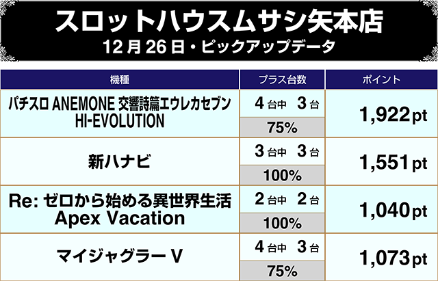 【12/26スロットハウスムサシ矢本店をピックアップ】