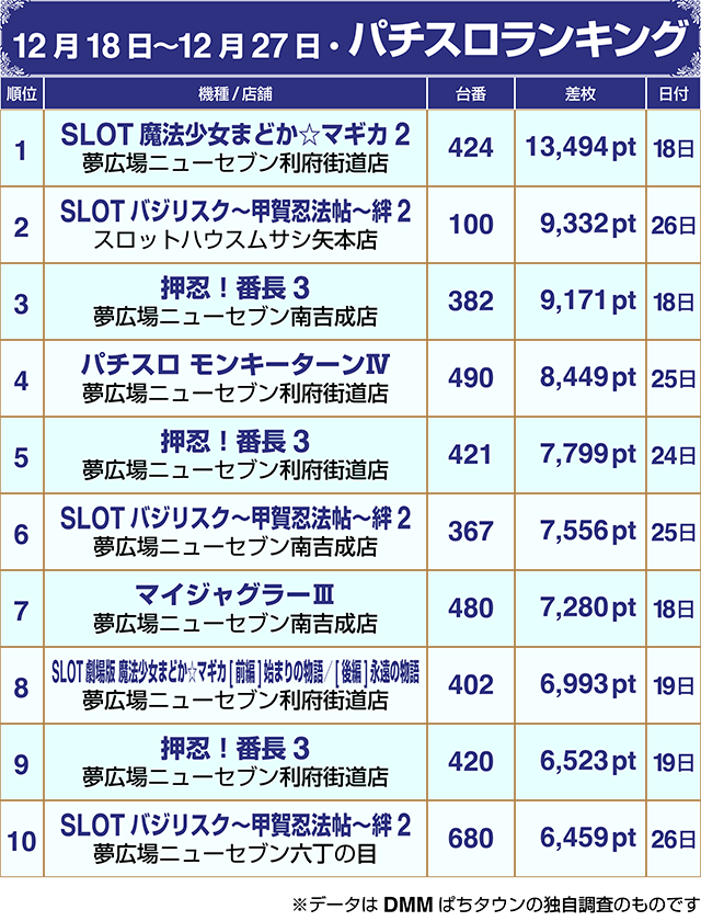 【パチスロ12月18~12月27日ランキング】