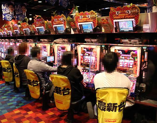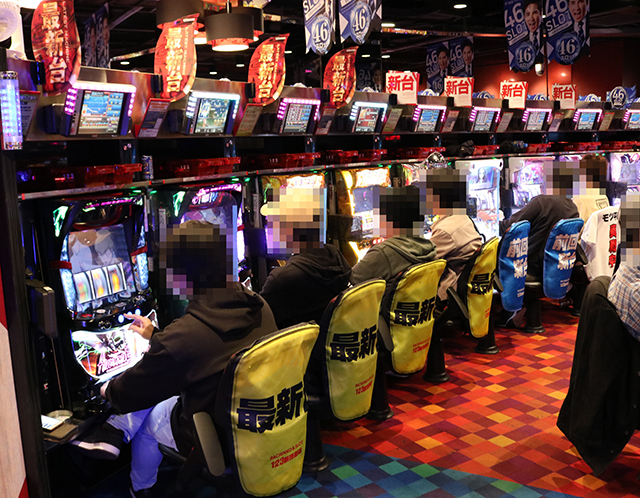 そして開店するや否や、新台の『パチスロANEMONE 交響詩篇エウレカセブン HI-EVOLUTION』『パチスロGANTZ極 THE SURVIVAL GAME』『チバリヨ-30』をはじめ、『SLOTバジリスク~甲賀忍法帖~絆2』『押忍!番長3』『パチスロコードギアス 反逆のルルーシュ3』などがどんどん埋まっていく光景を目撃。