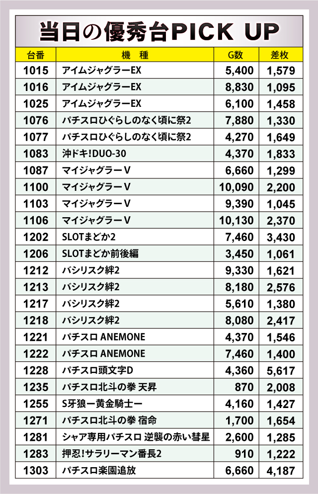 優秀台をチェックしていこう。まずは+5,617枚をマークした『パチスロ頭文字D』の1228番台。続いて+4,187枚の『パチスロ楽園追放』1303番台が後を追う。それに続くのが+3,430枚の『SLOT魔法少女まどか☆マギカ2』1202番台、そして『SLOTバジリスク〜甲賀忍法帖〜絆2』の1213番台が+2,576枚、同じく1218番台が+2,417枚を記録した。また、稼働が素晴らしかったのが『マイジャグラーⅤ』。1106番台は10,130Gで+2,370枚、1100番台は10,090Gで+2,200枚と上々の成績を見せた。