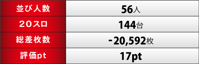 あちこちで優秀台は見られたものの、全体的には出玉は不調で、トータルの差枚はマイナスに甘んじてしまった。それでも、評価ptは17ptを獲得しており、お客さんの満足度は決して低くはなかったことを教えてくれた。この借りは次に返すとしよう。