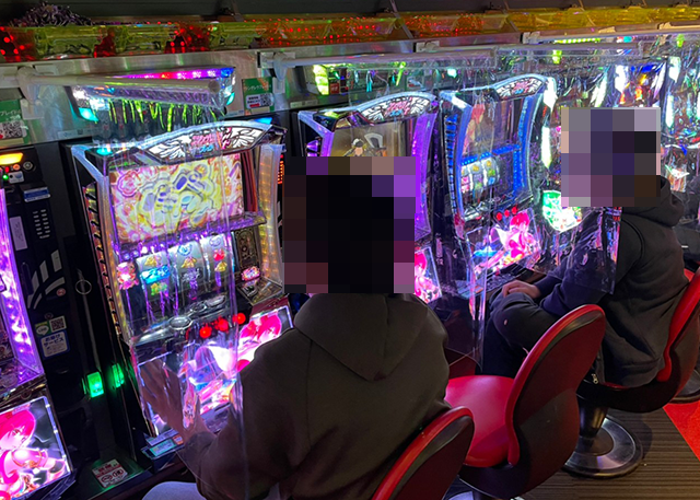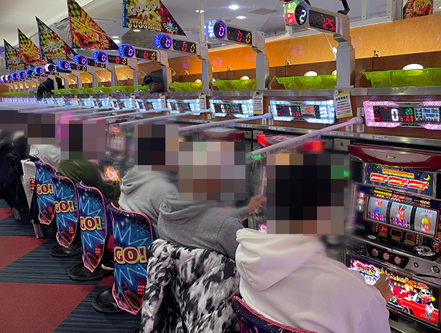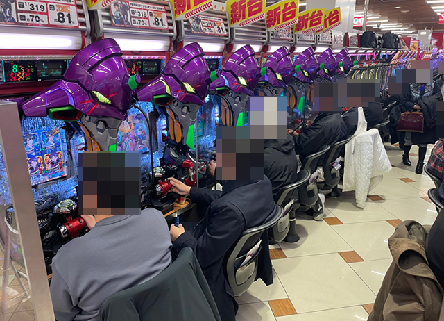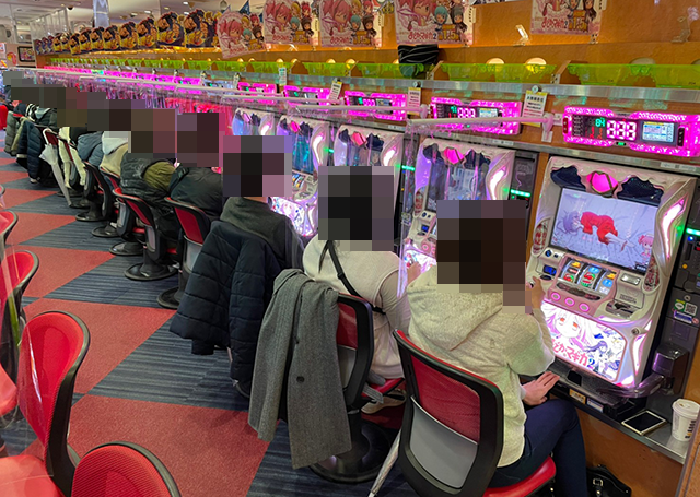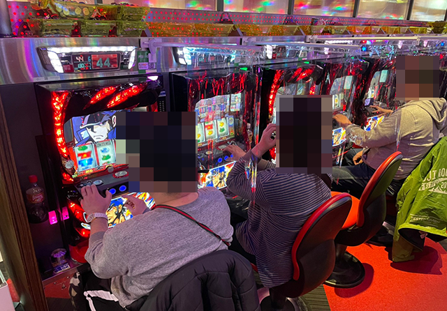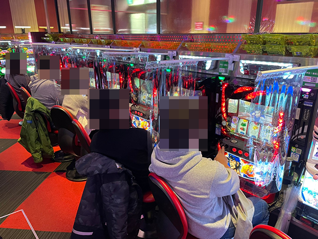 夕方をむかえ、さまざまな機種に遊技を楽しんでいる姿があった「新橋UNO」!