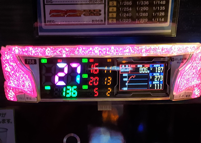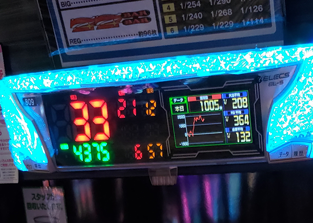 17時頃にデータカウンターを確認すると、ボーナス回数が30回の台やボーナス合算確率が1/120以上の台があった。