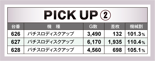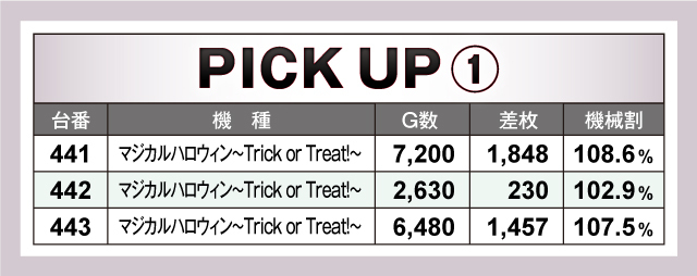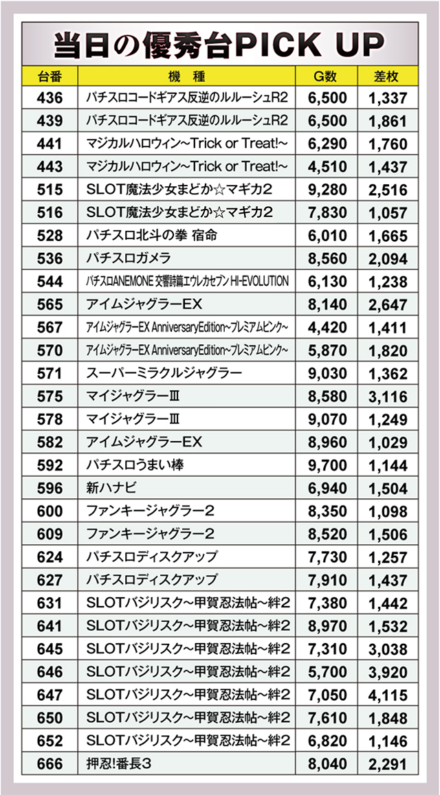並びでの結果に着目すると、上記の3ヶ所がずば抜けて優秀な数値となっていた。『マジカルハロウィン~Trick or Treat!~』『パチスロディスクアップ』は3台並びで3台ともにプラス、『SLOTバジリスク~甲賀忍法帖~絆2』は4台並びで4台ともにプラスと、分かりやすい配置だったのではないだろうか。「出ている台の隣を疑う」、これが当企画の有効な立ち回りの1つである。