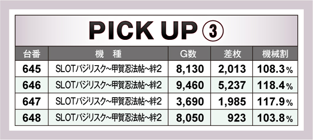 パッと上表を見た感じでは、多くの機種が2台ずつ優秀な結果を残しているのがわかる。これはつまり、各機種に2台ずつ優秀台が配備されていたのか?それともただの偶然なのか。さらに『SLOTバジリスク~甲賀忍法帖~絆2』に至っては7台もの好結果が生まれていたようだ。