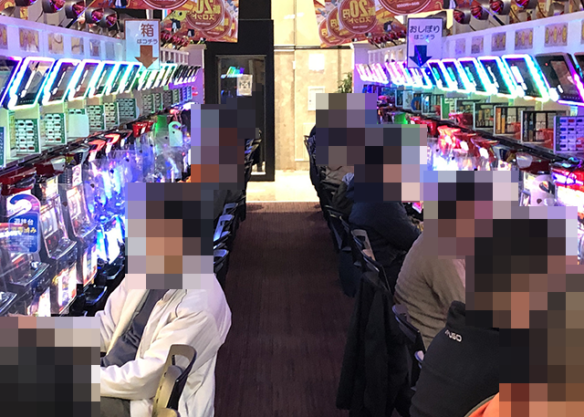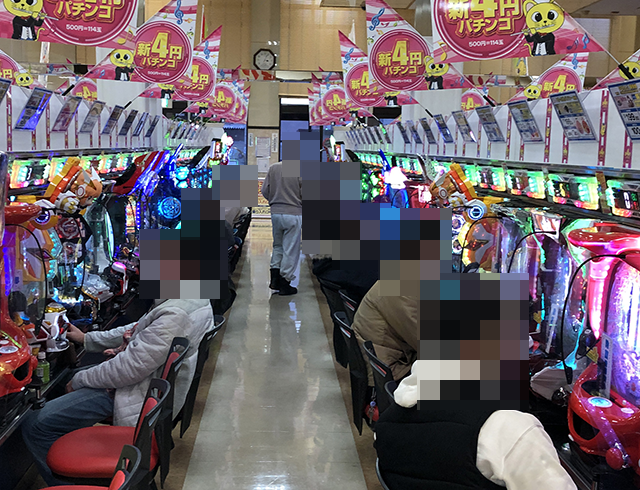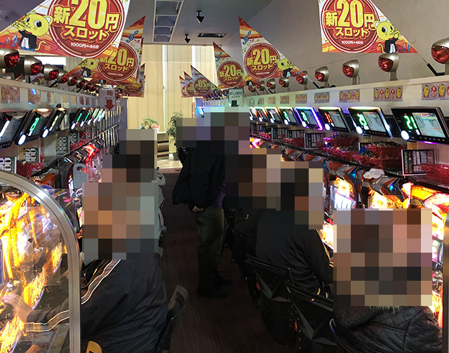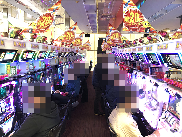 パチスロを中心に活況となっていた「コンサートホール吉田店」。ホール全体に華やかな光景が広がっていた。