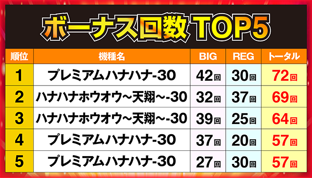 1位の座をかけて、「プレミアムハナハナ-30」と「ハナハナホウオウ~天翔~-30」の2機種が大接戦!