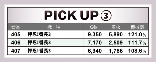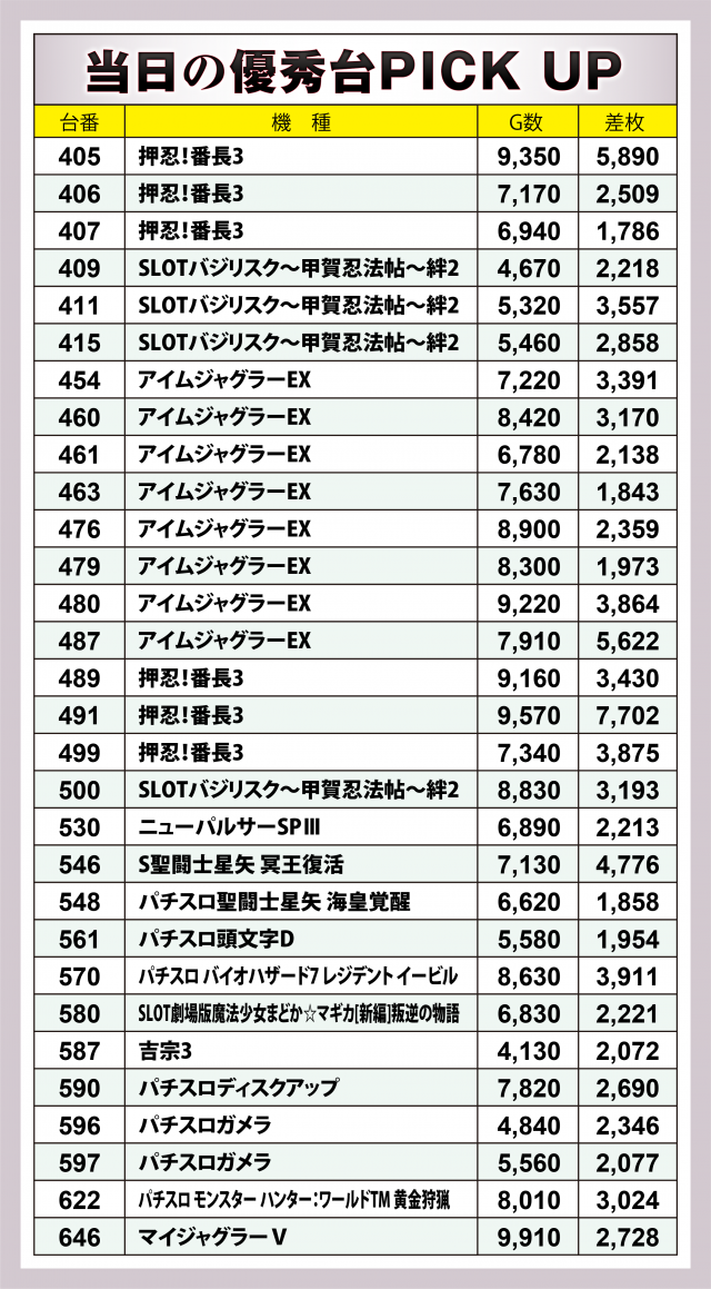 ここからはまず当日の優秀30台PICK UPから振り返っていこう。後述する横並び好況スポットと重複するもそちらを含めて『押忍!番長3』が差枚数で好スコアを残した。プラス上位6台でトータル+2万5千枚突破! その他ではプラス台の数では『SLOTバジリスク~甲賀忍法帖~絆2』、取材日に新台導入間もない『S聖闘士星矢 冥王復活』の差枚数などが目立った。