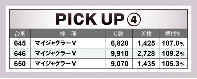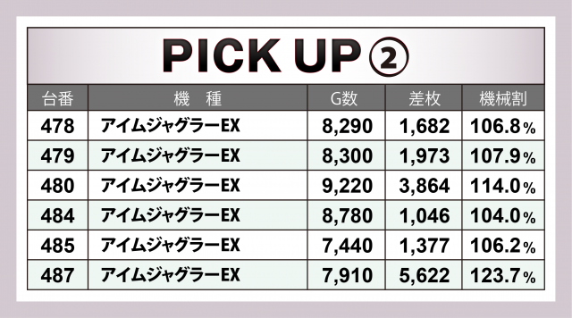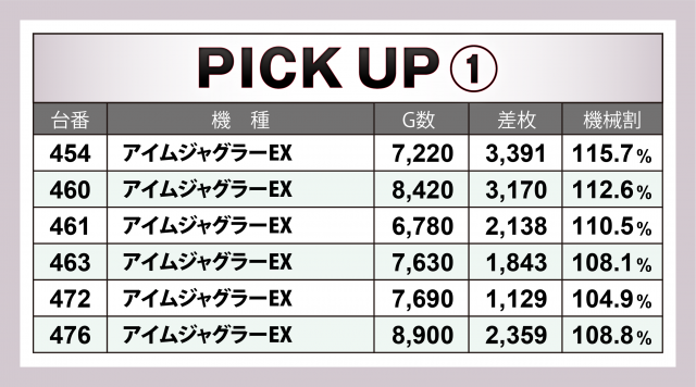 またこの日は横並び好況スポットが3機種で出現。その中でも特に光ったのが『アイムジャグラーEX』。対象12台全てがプラス、1台あたり+1,300枚の安定度を誇った。その他の対象6台も全てプレイヤーの浮きとなりその平均は2千7百枚をマーク!