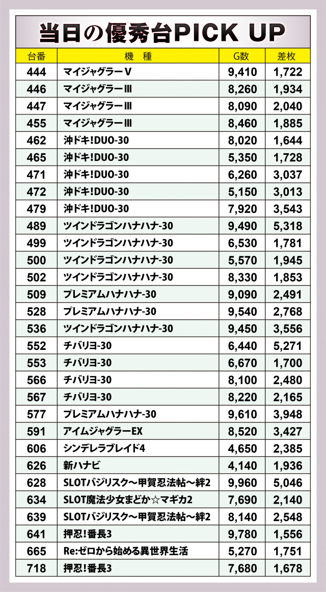 まずは当日の優秀30台PICK UPから。この日は30パイマシンが上位30台の過半数を占め、差枚数の数で一際目立ったのが『ツインドラゴンハナハナ-30』と『プレミアムハナハナ-30』の2機種で前者はプラス5台で+1万5千枚に迫る勢い。また次いで『チバリヨ-30』も好調。また『押忍!番長3』『SLOTバジリスク~甲賀忍法帖~絆2』も差枚のスコア以上にドル箱使用台が目に付いた。