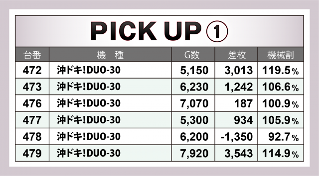 またこの日は『沖ドキ!DUO-30』が横並び6台で好況。マイナス台はあったものの、トータル差枚数は7千枚を超えた。