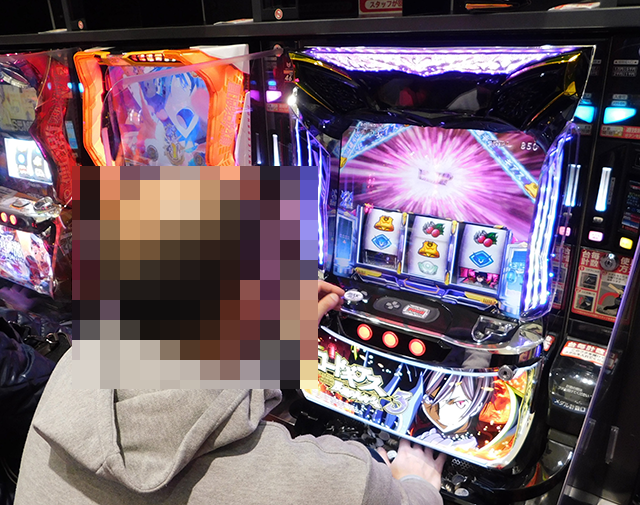 隣同士に設置された「パチスロ戦姫絶唱シンフォギア 勇気の歌」と「パチスロコードギアス 反逆のルルーシュ3」でも、プレイヤーがパフォーマンスを披露!