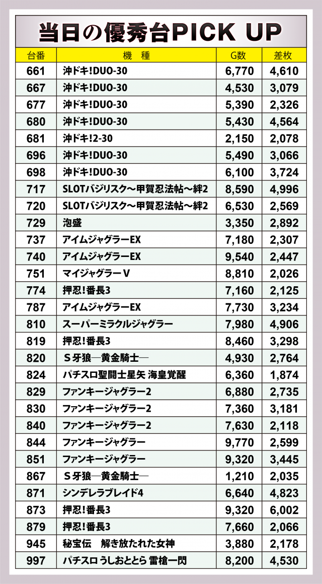 まずは当日の優秀30台のPICK UPから。1台を除くほとんどの台が差枚数プラス2千枚以上を達成し、沖ドキ&ジャグラーシリーズが好出玉を記録。『沖ドキ!DUO-30』は5台で+2万枚突破、『ファンキージャグラー2』は3台で+8千枚を超えをマーク!