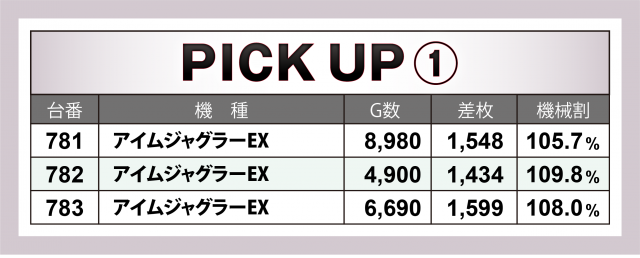 さらに、『アイムジャグラーEX』が横並び3台で好調の気配。安定の結果を残した。