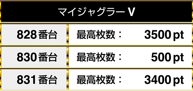 『マイジャグラーV』にも3台並びでプラスptとなる場所があり、なかには3000ptを上回るデータも残っていた。