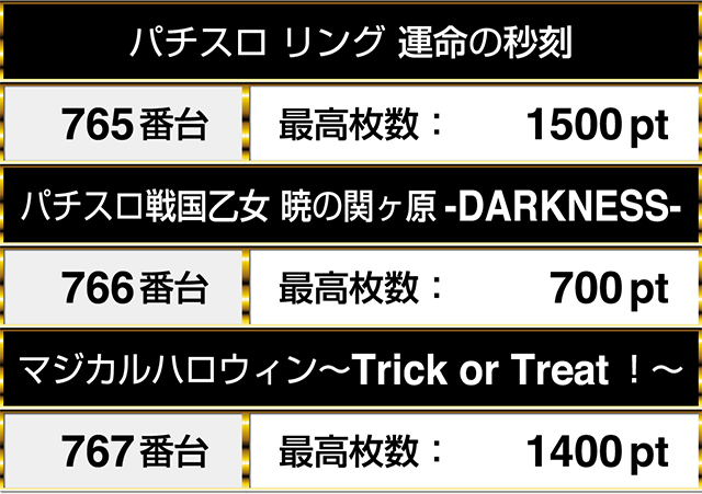 バラエティコーナーでは、『パチスロ リング 運命の秒刻』の765番台から『マジカルハロウィン〜Trick or Treat!〜』の767番台までが並んでプラスptを記録!