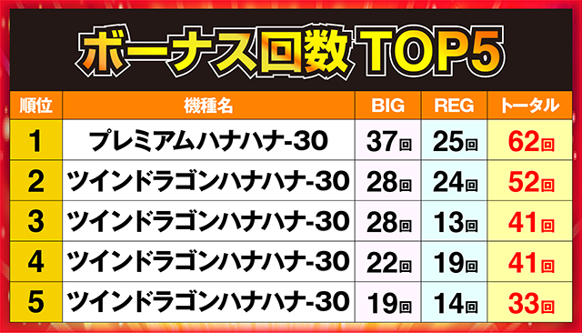 ボーナス回数62回を記録した「プレミアムハナハナ-30」の1台が堂々のトップ!
