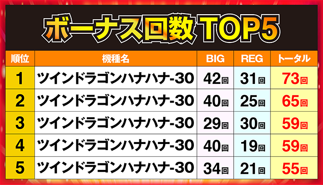 上位2台のボーナス回数は60回を超えており、73回を記録した台が1位に輝いた。