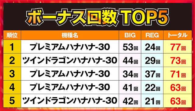 熾烈なトップ争いを制したのは、77回を記録した「プレミアムハナハナ-30」であった。