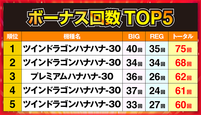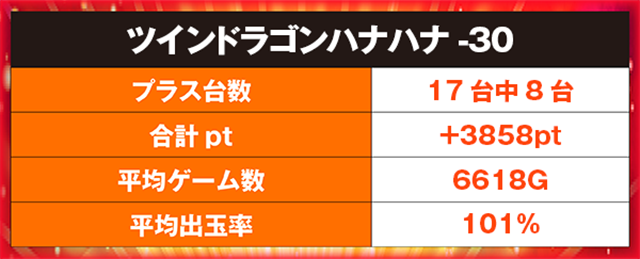 「プレミアムハナハナ-30」の1台が3位に食い込むも、5台中4台が「ツインドラゴンハナハナ-30」!!