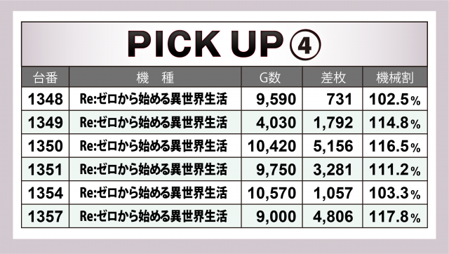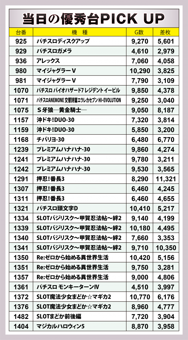 まずは当日の優秀30台PICK UPから。この日は30台の中では1台のみを除いて差枚数+3千枚以上を達成。後述する横並び好況スポット以外では、『押忍!番長3』に万枚突破台がありプラスとなった3台のトータル差枚数は2万枚超え! その他では沖スロを中心に好調台が目立った。