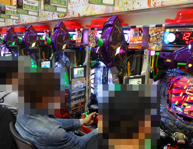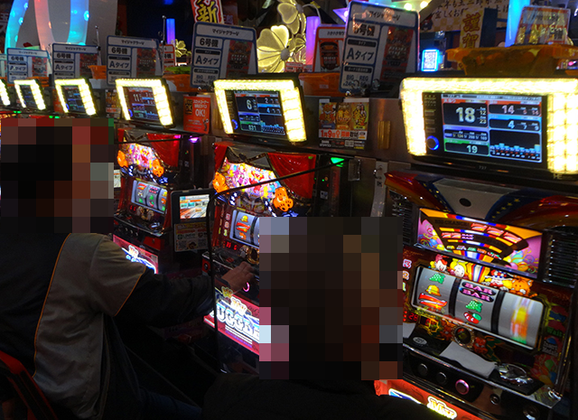 9台中4台が埋まっており、プレイヤーたちは楽しそうに遊技中。
