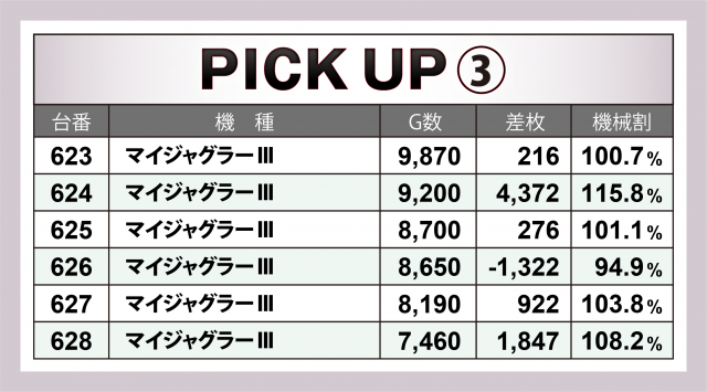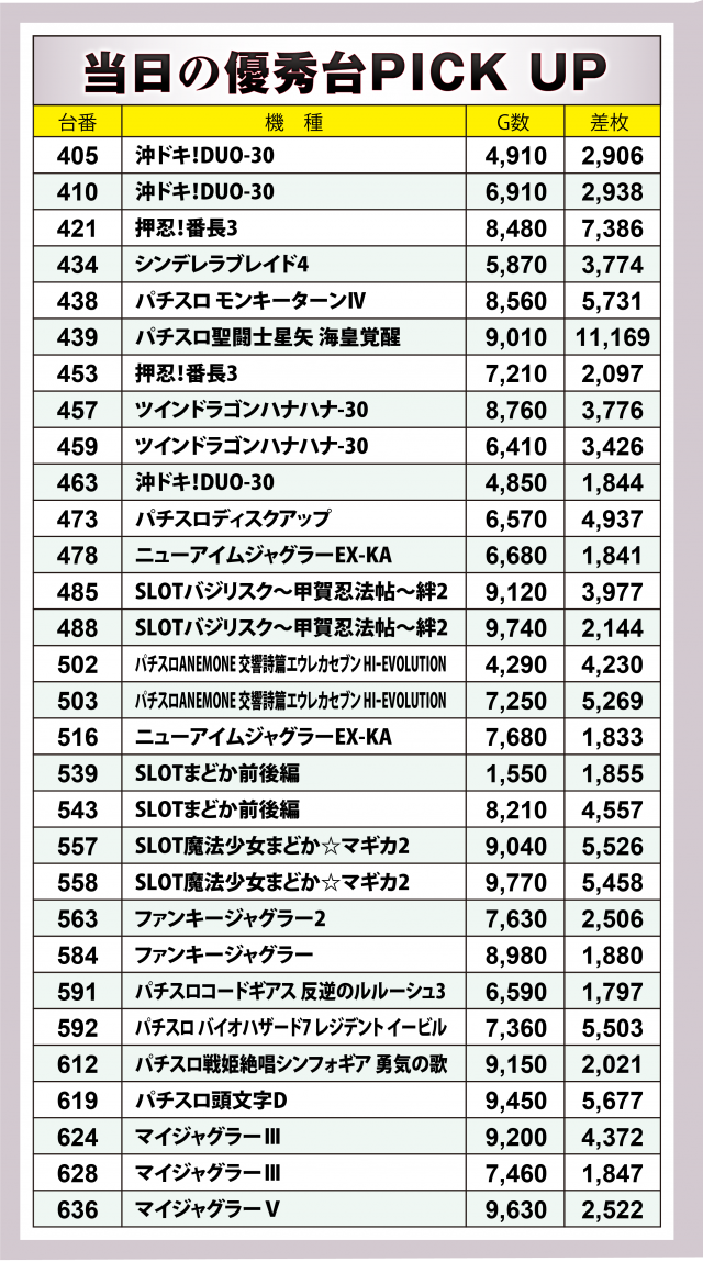またこの日は横並び好況スポットが3か所出現。取材対象はボーナスタイプ中心だったが、差枚数で秀でたのは『SLOT魔法少女まどか☆マギカ2』『ツインドラゴンハナハナ-30』で、前者は6台・後者は5台それぞれの合計で+1万枚を超えた。
