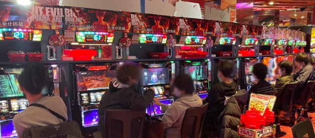 ではまず最初に当日のパチスロ優秀30台のPICK UPから。後述する横並び好況スポット以外で差枚数が秀でていたのは『パチスロ バイオハザード7 レジデント イービル』『押忍!番長3』の2機種。ドル箱を重ねた台が目立ち、差枚数プラス5千枚の台も。