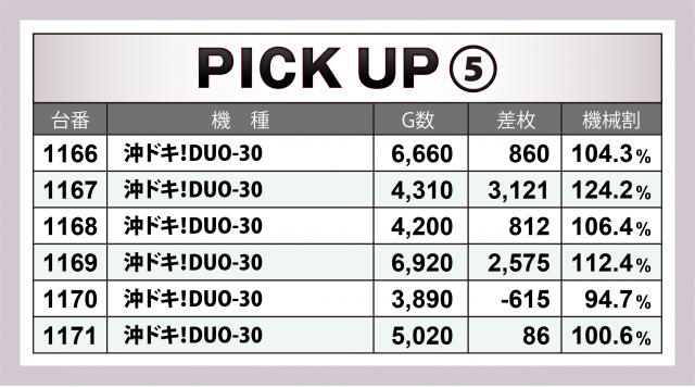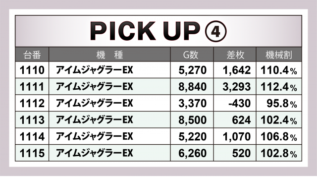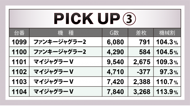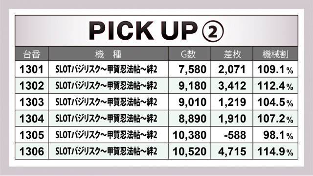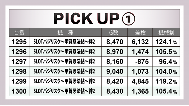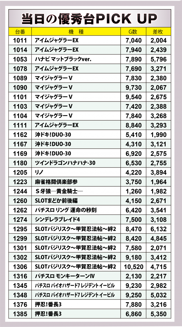 またこの日は5機種の好況横並びスポットが出現。中でも『SLOTバジリスク〜甲賀忍法帖〜絆2』は12台が対象でトータル+2万6千枚近い差枚数に。中には6千枚突破台も! その他ではジャグラーシリーズ3機種も対象となりマイナス台もあったが安定した結果を残した。