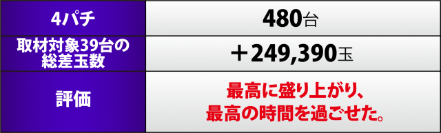 この日は、[21.73] スロ全体で差枚数-10,503枚のマイナス、一方で4パチの取材対象では+249,390発の大勝利となり、両ジャンル揃っての快哉とはならなかった。とは言え、スロにはドル箱使用台も多くパッと見ではトータルマイナスを微塵も感じることができなかったほどの好況。十二分に勝負できる店舗として、次回の「英雄」取材実施に期待したい。