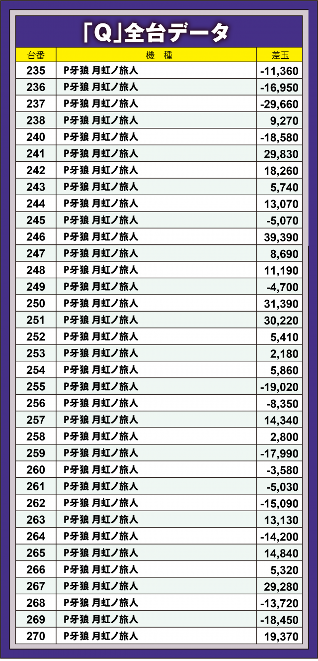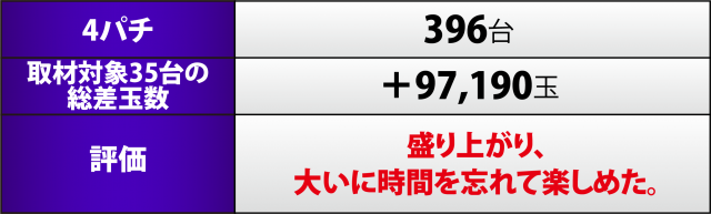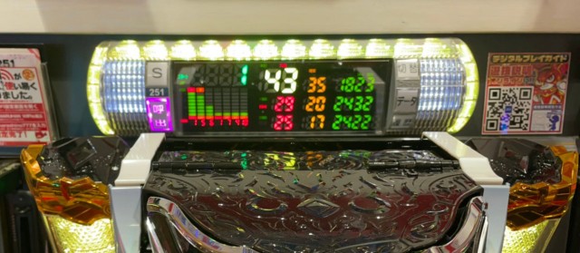 この日、Qが見守る中4パチで取材対象となったのが過去3回でもスポットが当たった『P牙狼 月虹ノ旅人』。差玉数+3万発クラスの台が頻発していた。また、着席したファンが興奮の面持ちで通常時回転を消化していたのが記憶に残った。