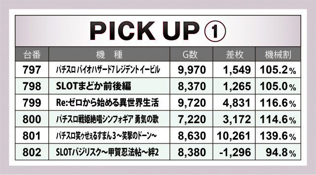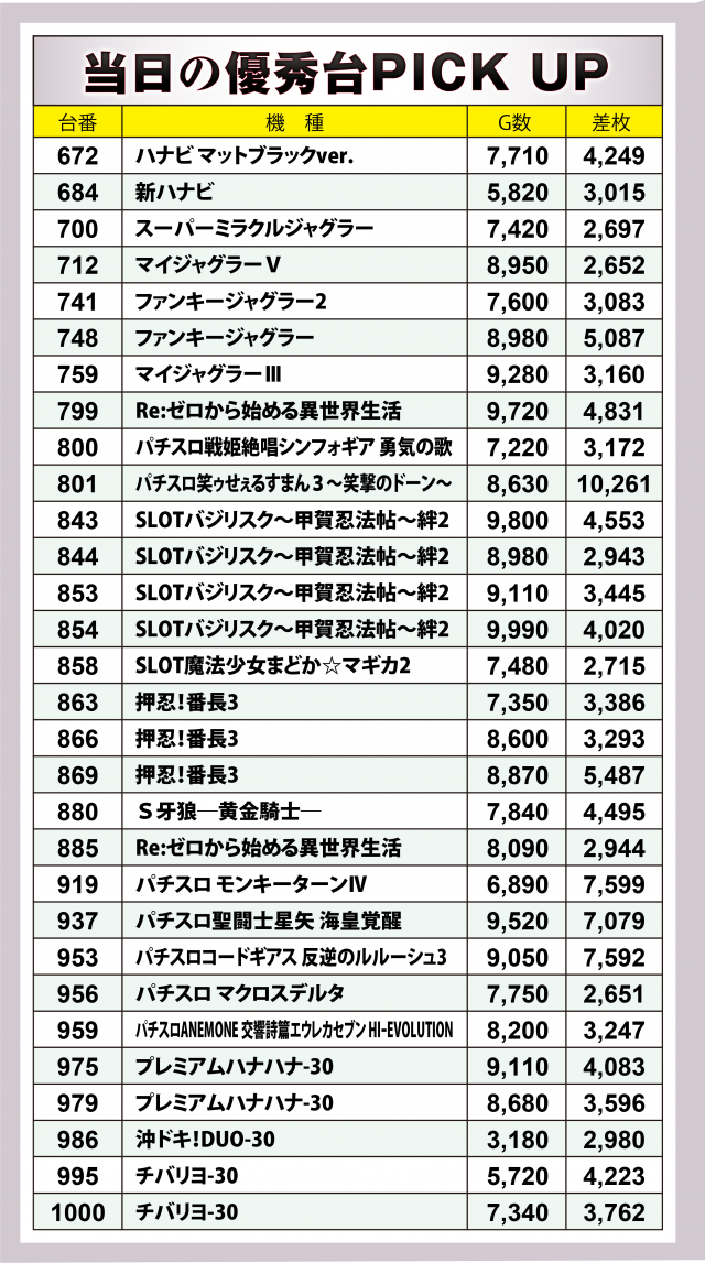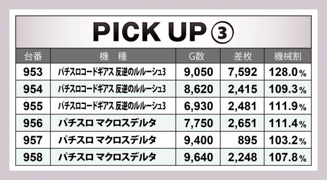 さらに当日は3か所の横並び好況スポットが出現。最も高い差枚数を収めたのは『パチスロ笑ゥせぇるすまん3〜笑撃のドーン〜』で+1万枚を突破! また『パチスロコードギアス 反逆のルルーシュ3』『パチスロ マクロスデルタ』計6台は全てがプラス、中には+7千5百枚超を記録した台も。