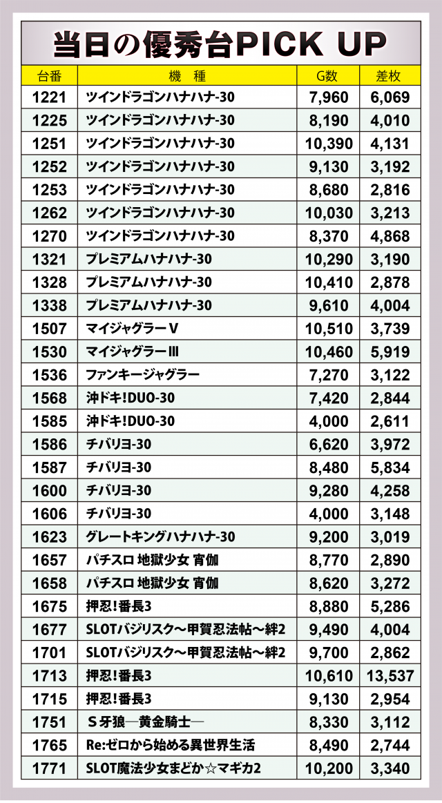 まずはパチスロ優秀30台PICK UPから注目。30台全てが差枚数+2千枚以上、うち20台が30パイマシンを含めた告知台で、同店では設置数の多いハナハナシリーズが+3千~6千枚超の台が頻発という結果に。後述する横並び好況スポット以外では『パチスロ 地獄少女 宵伽』『SLOTバジリスク~甲賀忍法帖~絆2』がそれぞれ2台で+6千枚クラスの差枚を叩き出した。