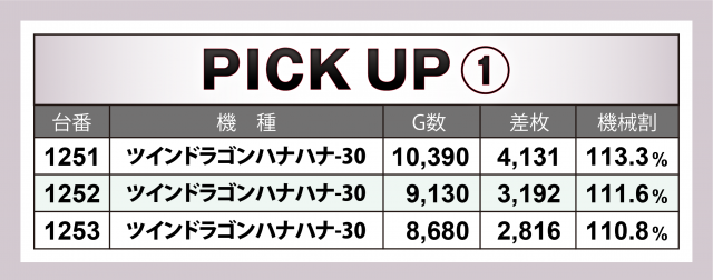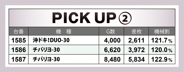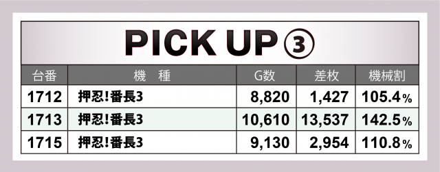 またこの日は3台ずつの横並び好況スポットが出現。触れずにいられないのは『押忍!番長3』。+1万3千枚突破台を筆頭に3台全てがプラスに。なお上のPICK UP30台データでもお分かりの通りこの3台並び以外にも『番長3』は+5千枚超えの好調台あり。その他2か所は30パイマシンが対象となり、こちらも3台全てプラス&それぞれがトータルで+1万枚超を達成!