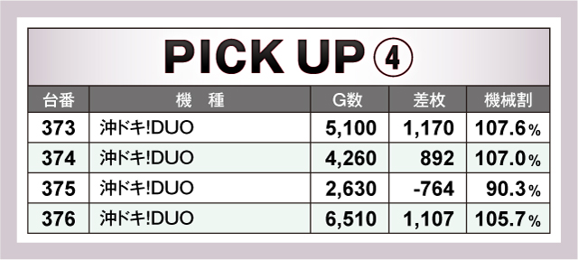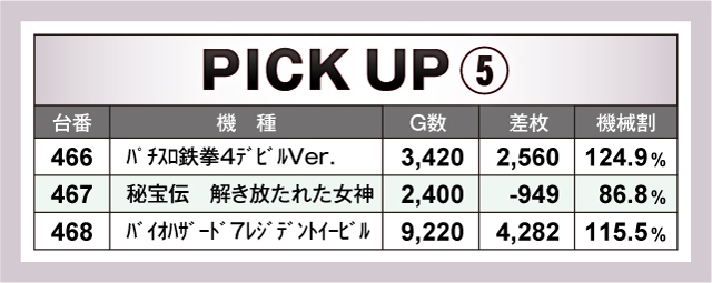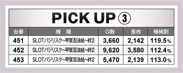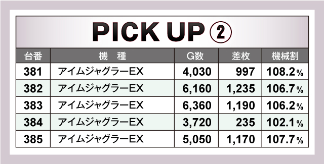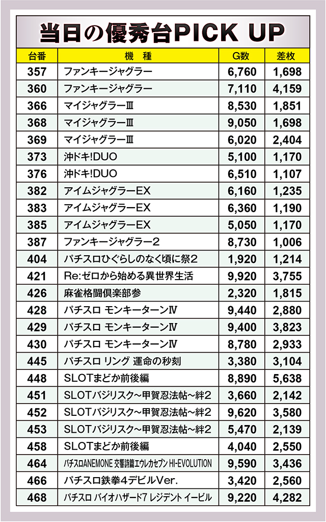上表をご覧の通り、おなじみ『ジャグラー』シリーズは元より、当代きっての人気AT機からも順当なプラス記録がズラリ。特に後半のAT機からは3,000枚オーバー記録が複数台に渡って飛び出しているのがわかる。また、2台並びで好記録が生まれているのは前回同様だ。