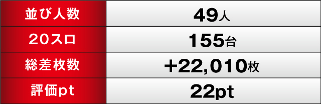 優秀機種、ピックアップ機種以外の台も好調で、トータルの差枚も+22,010枚を記録。評価ptも前回を大きく上回る22ptを獲得。まずは幸先の良いスタートを切ったのであった。