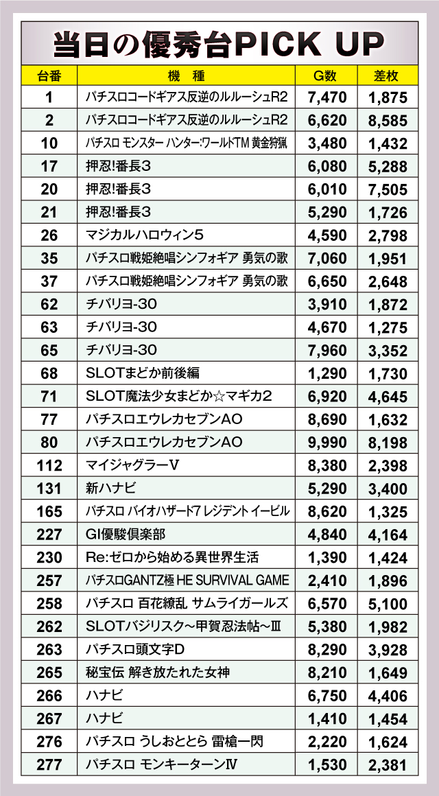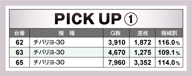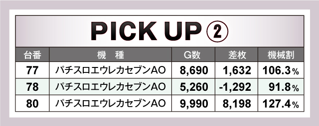 ピックアップ機種では、『チバリヨ-30』が3台ともプラス、前述の『エウレカAO』が3台トータルで大幅なプラス差枚を記録した。