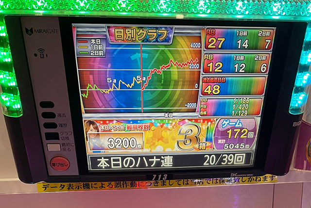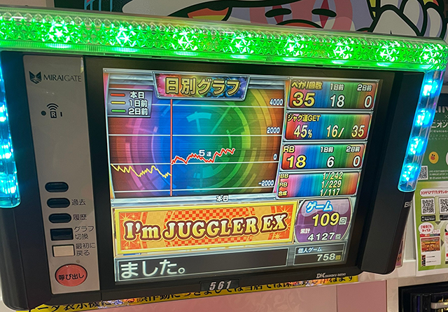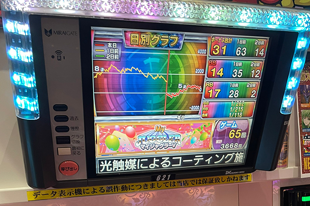 取材時はボーナス合算確率が1/120以上の台が複数みられるなど、気になるデータがいくつもあった。