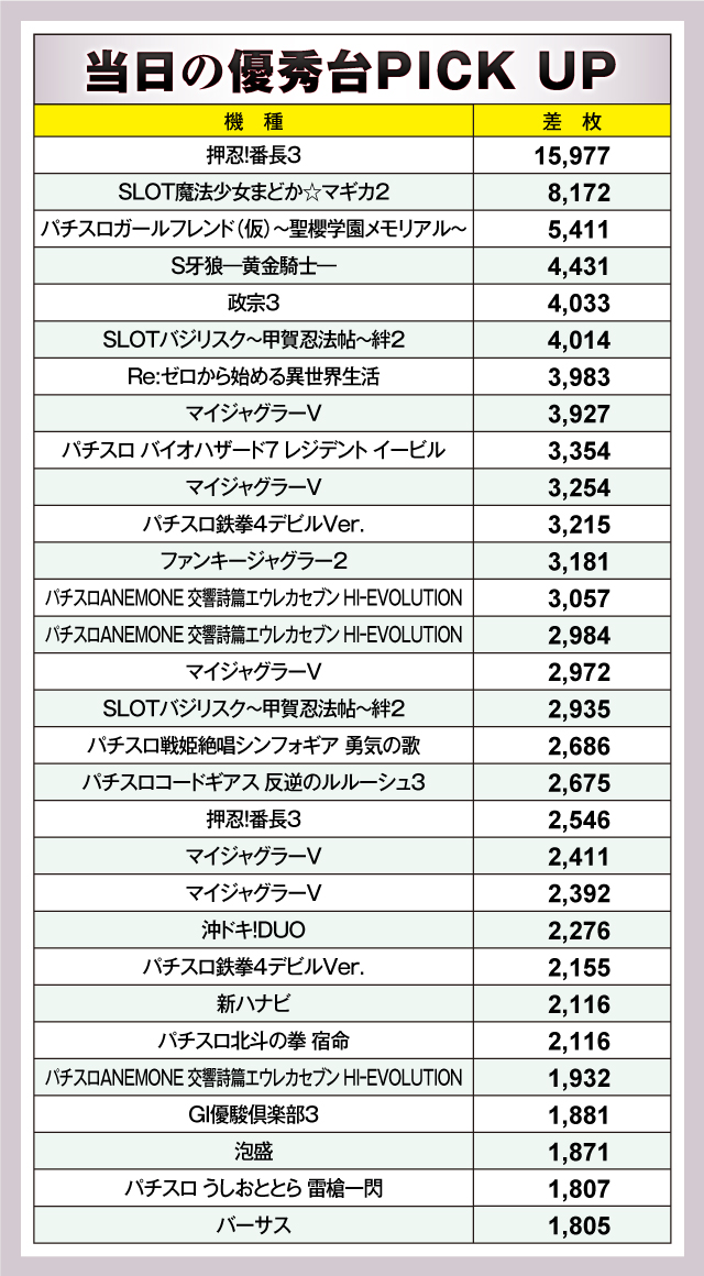 様々な機種から優秀台が出現するのが同店の「英雄」の特徴であるが、この日も例に漏れず、多種多様な機種から驚きの歓声が聞こえた。特に『押忍!番長3』や『バーサス』『シンフォギア』など、残念ながら1月末で入替となる5号機から最新の6号機まで、ホール中で大盛り上がりとなった。