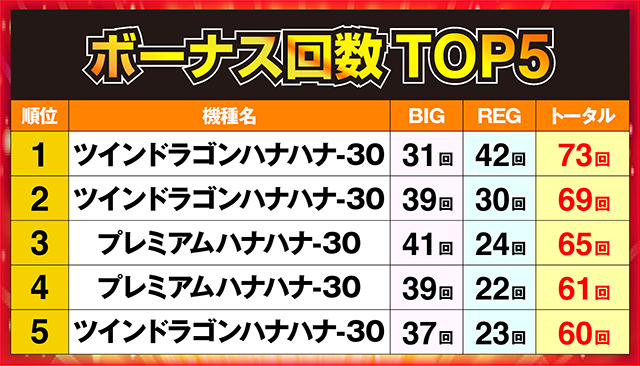 ボーナス回数60回以上が多発したなかで、73回を記録した台が堂々のトップに輝いた。