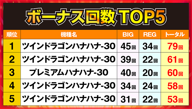 「プレミアムハナハナ-30」もボーナス60回を記録し、3位にランクインした。