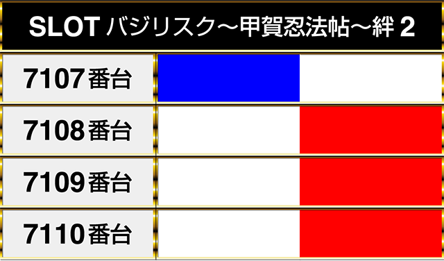 『SLOTバジリスク~甲賀忍法帖~絆2』の3台が並んでプラスptを記録!