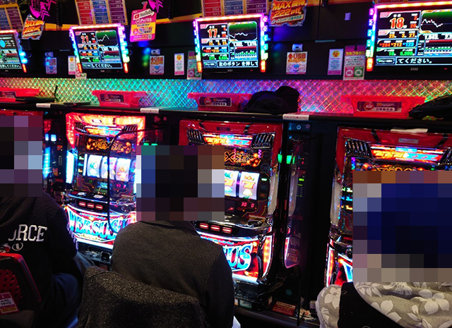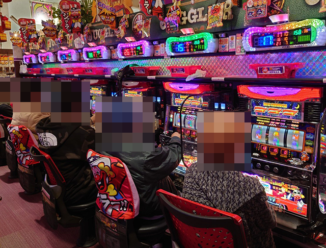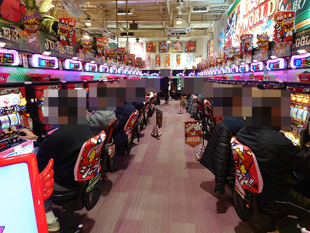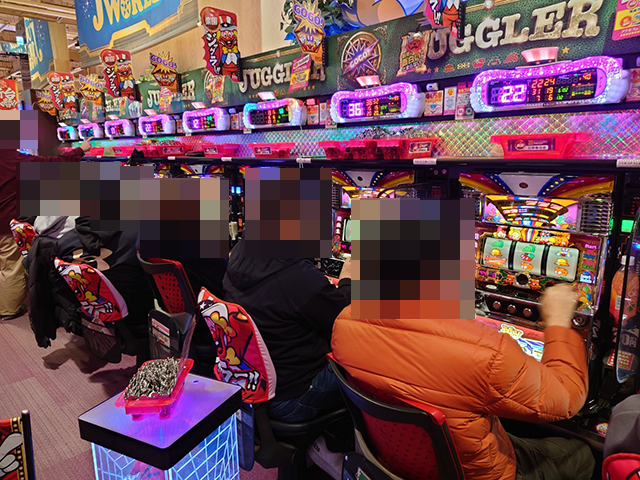 「マイジャグラーⅢ」や「マイジャグラーV」、「アイムジャグラーEX」など、多数の機種が楽しまれており、大きな活気に包まれていた。