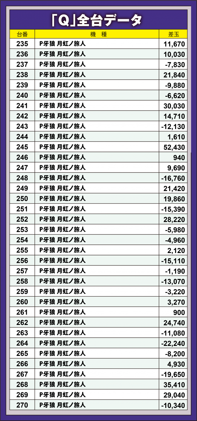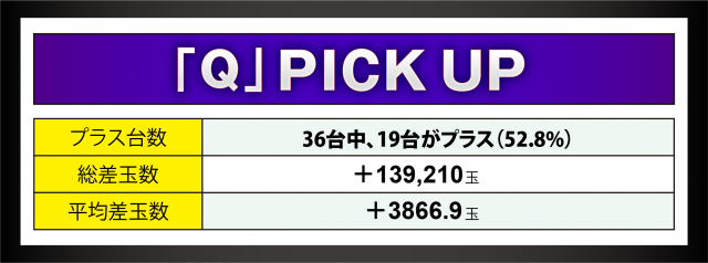 Qが見守る中当日の4パチで取材対象となったのは同店ではおなじみの『P牙狼 月虹ノ旅人』。差玉数+3万発近い台が頻発する中、トップは5万2千発を残した台。また恒例となっている対象台だが、ファンが何より楽しそうに通常時回転をこなしているのが印象的だった。