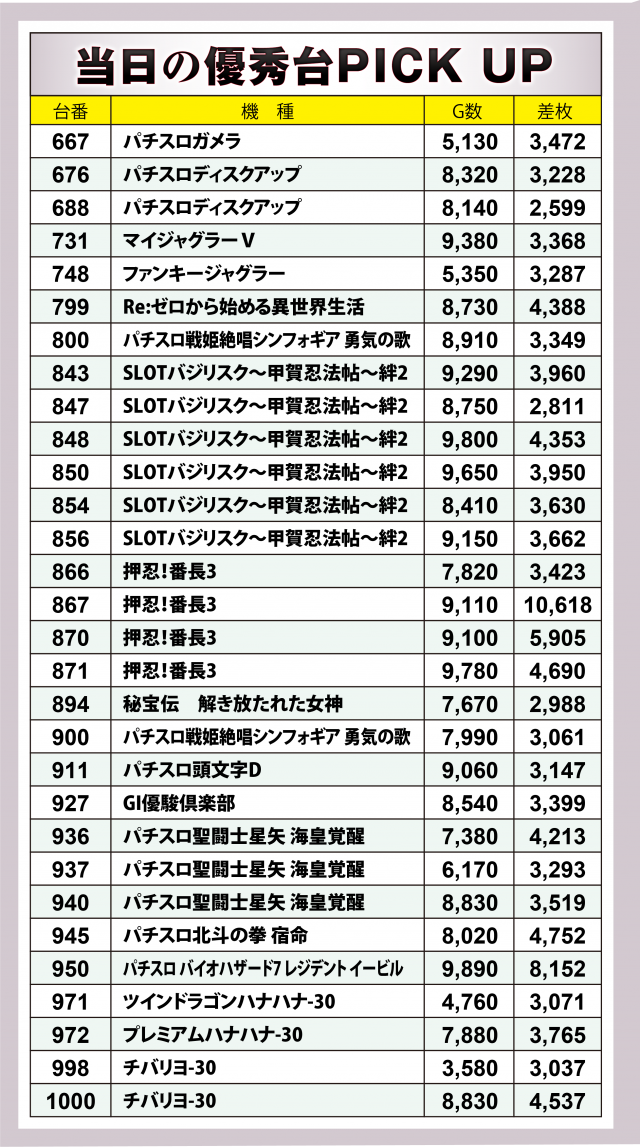 まずはパチスロ優秀30台のPICK UPから。30台全てが差枚数+2千枚を超え、うち27台が+3千枚以上となる中、後述する横並び好況スポット以外で触れて起きたいのは『押忍!番長3』。万枚突破台を筆頭にプラス3台で+2万枚超を達成、その他では『パチスロディスクアップ』『パチスロ聖闘士星矢 海皇覚醒』や沖スロ各種のハイスコアが光った。